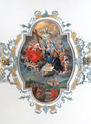 Besonders eindrücklich ist die Darstellung im Deckenbild des Kirchenschiffes, auf dem Jost von Christus - im Beisein von Gott Vater, dem heiligen Geist, Maria und Josef - die göttliche Krone überreicht erhält.